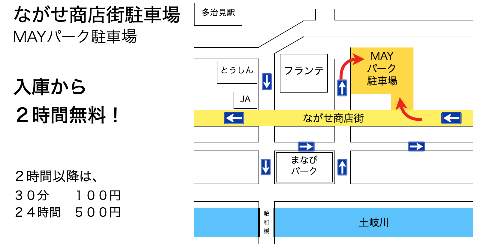 お店の前の道路は、多治見橋から駅へ向かって「一方通行」ですのでご注意ください。